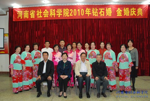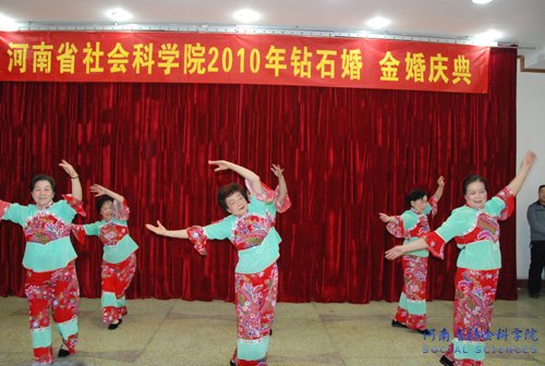 讲话结束后,大会放映了院信息中心制作的钻石婚、金婚夫妇合影短片。张湘霓老师畅谈了金婚感悟、张清华老师、卢连章老师各自作诗一首纪念钻石婚、金婚。图书馆、监察室、部分离退休职工为大家表演了文艺节目。演出结束后院领导与全体演出人员合影留念,庆典大会圆满结束。